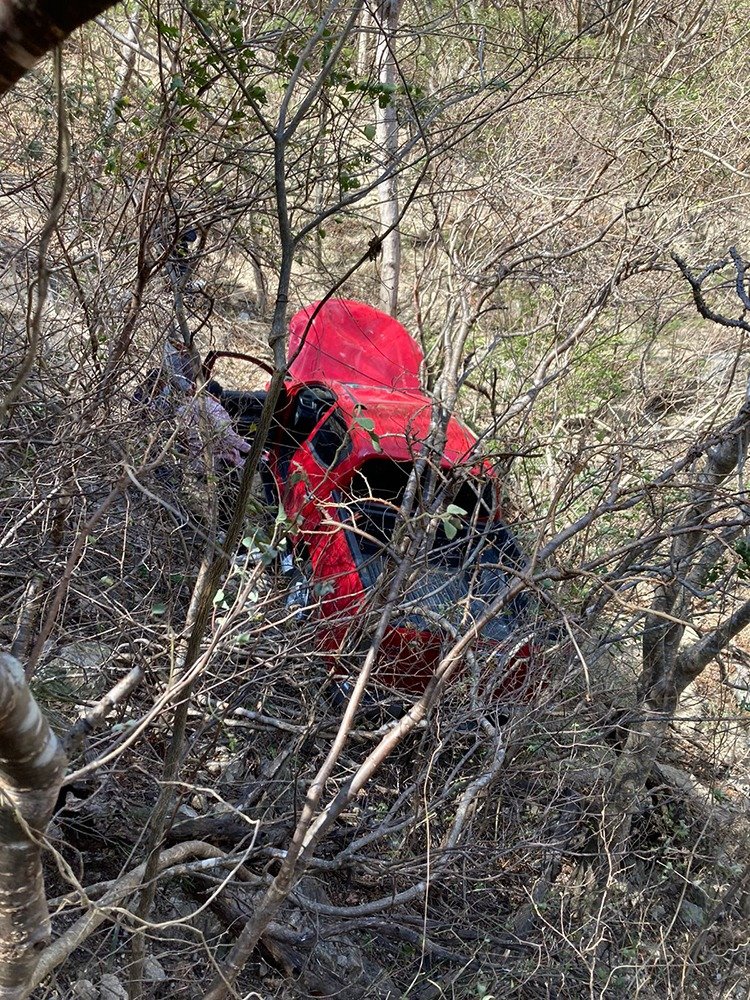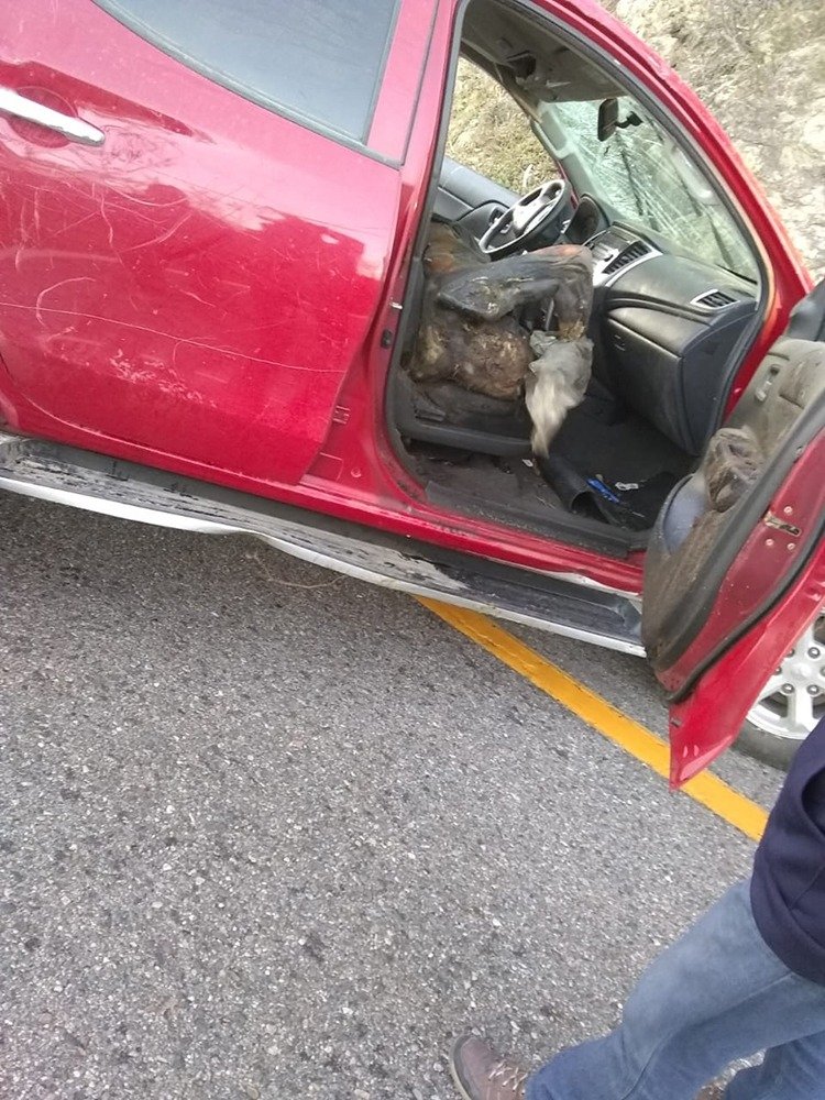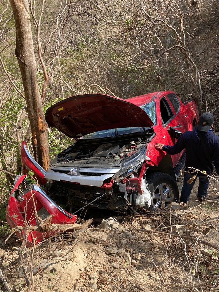Por lo anterior, al lugar arribaron, elementos de la Guardia Nacional, de la policía estatal preventiva, de la policía especializada y de la municipal, quienes se entrevistaron con una persona quien los llevó al punto donde estaba la unidad siniestrada, bajaron casi 100 metros hasta llegar a una camioneta de color rojo, de la marca Mitsubishi, de modelo reciente y dentro de la misma, estaba el cuerpo en avanzado estado de descomposición de un masculino, se presume que era el chofer.